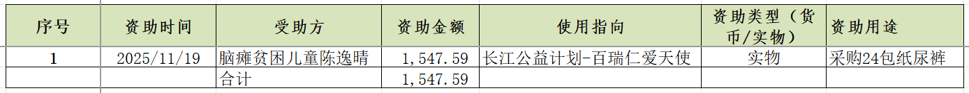 2025年11月长江科技扶贫基金会资助1,547.59元,现公示如下: