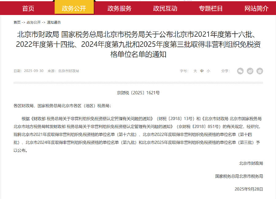 北京市财政局 国家税务总局北京市税务局关于公布北京市2021年度第十六批、2022年度第十四批、2024年度第九批和2025年度第三批取得非营利组织免税资格单位名单的通知